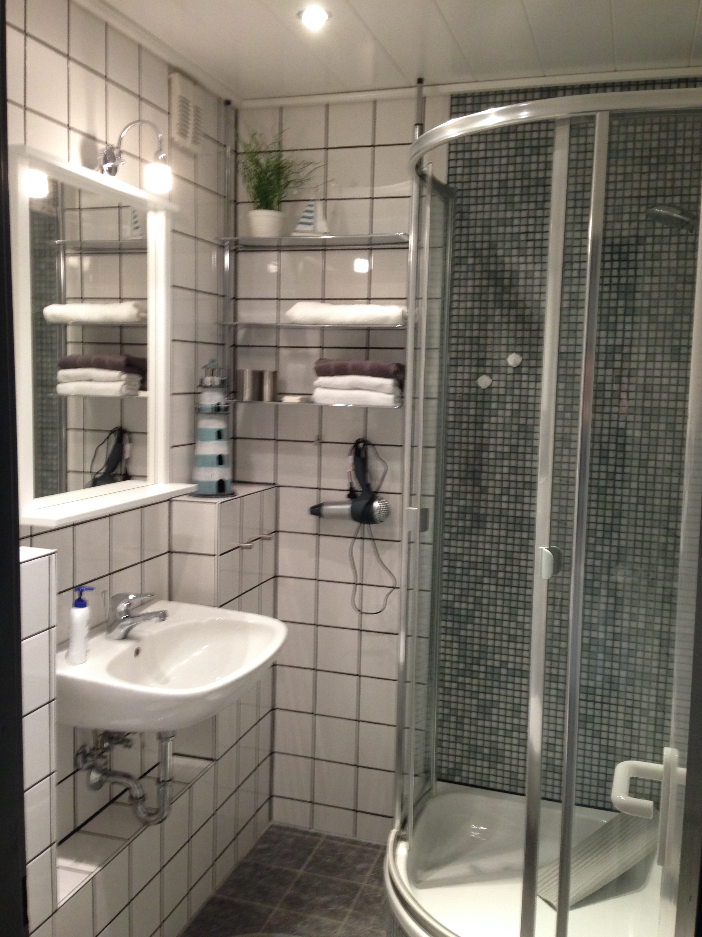 Im modernen Badezimmer finden Sie ein Hänge-WC, einen Fön, einen Handtuchheizkörper und eine große Dusche.