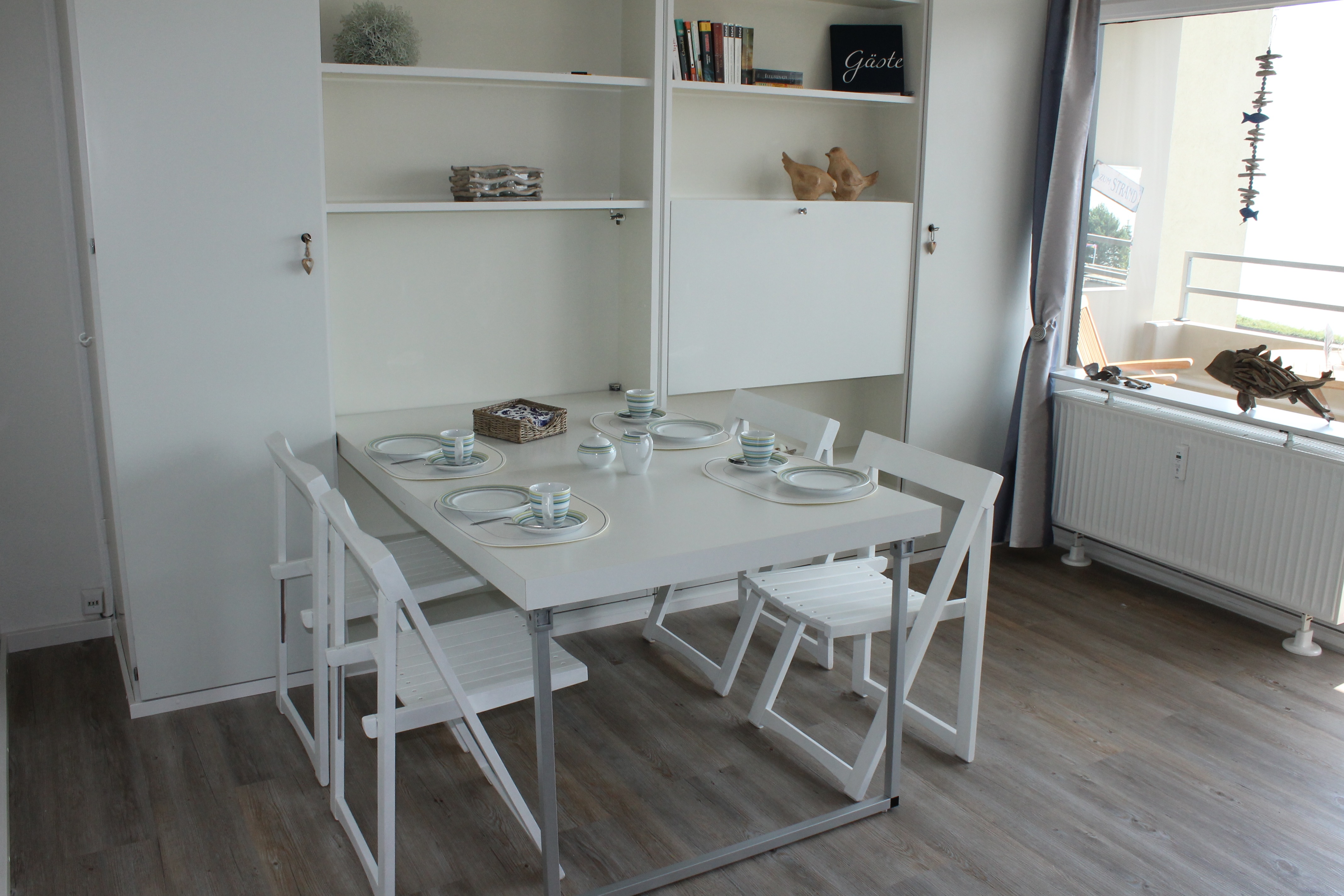 Die Wohnung hat ein Schlafzimmer mit einem Doppelbett und zwei Schrankbetten (als Doppelbett oder als Einzelbetten benutzbar) im Wohnraum. Die Küche ist mit einem Geschirrspüler, einer Mikrowelle mit Back/Grillfunktion, einem Kühlschrank mit Gefrierfach, einer Kaffeemaschine, einem Toaster, einem Wasserkocher, einem Minibackofen,einem Cerankochfeld und einem Mixer ausgestattet. Als Mieter unserer Wohnung steht Ihnen unser kostenloses WLAN zur Verfügung.